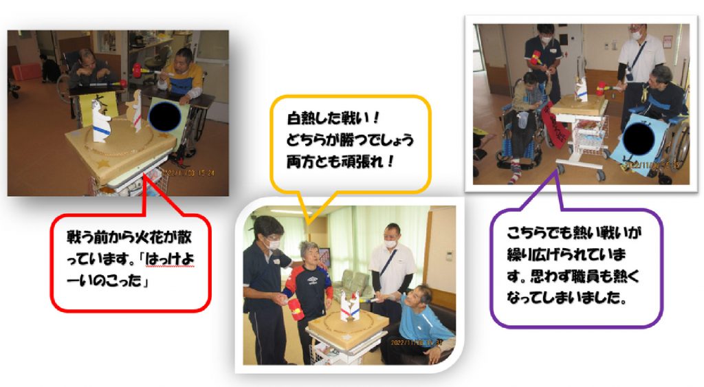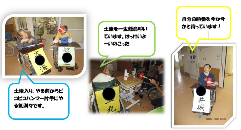 9月に予定していた男子会、コロナで延期になっていましたが、11月8日に行う事が出来ました。内容は「トントン相撲」です。男子会でも度々行っていましたが、4階病棟男性利用者全員で行なうのは初めてで、職員も楽しみにしていました。いざ始まるとピコピコハンマーを持って土俵を叩いている皆の様々な表情を見ることが出来、又声を出して喜んでとても盛り上がりました。コロナの影響で他病棟の利用者と出来なかったのは残念ですが、次の男子会では他病棟と交流できるのを楽しみに次何を行うか考えたいと思います。